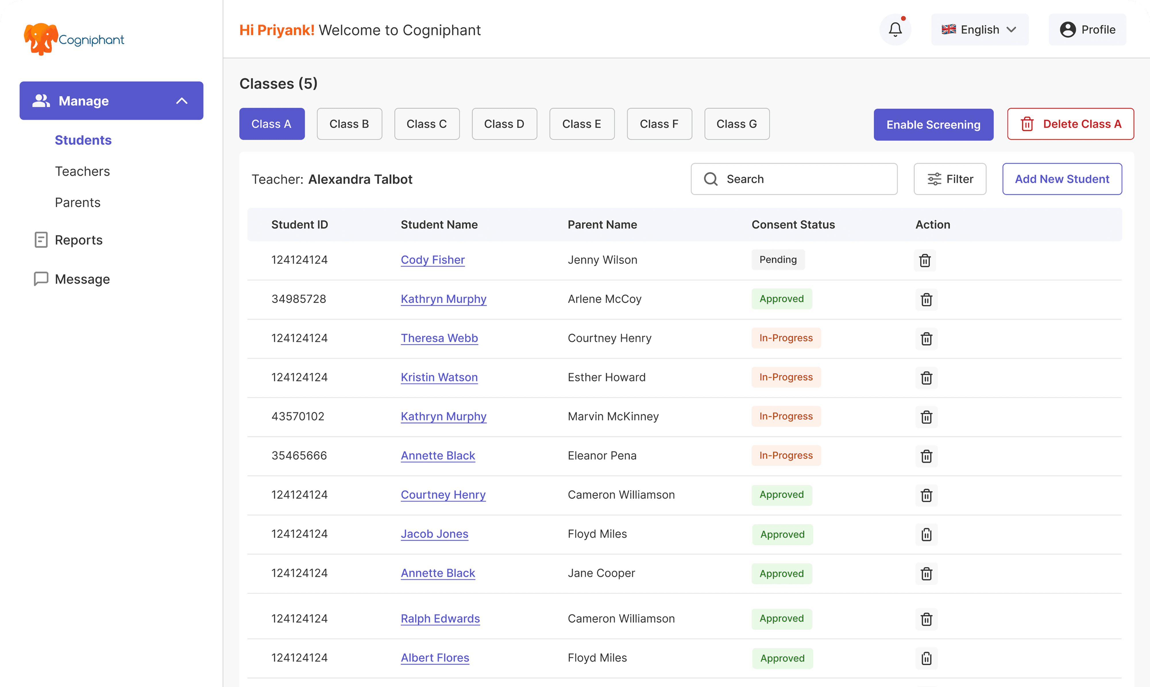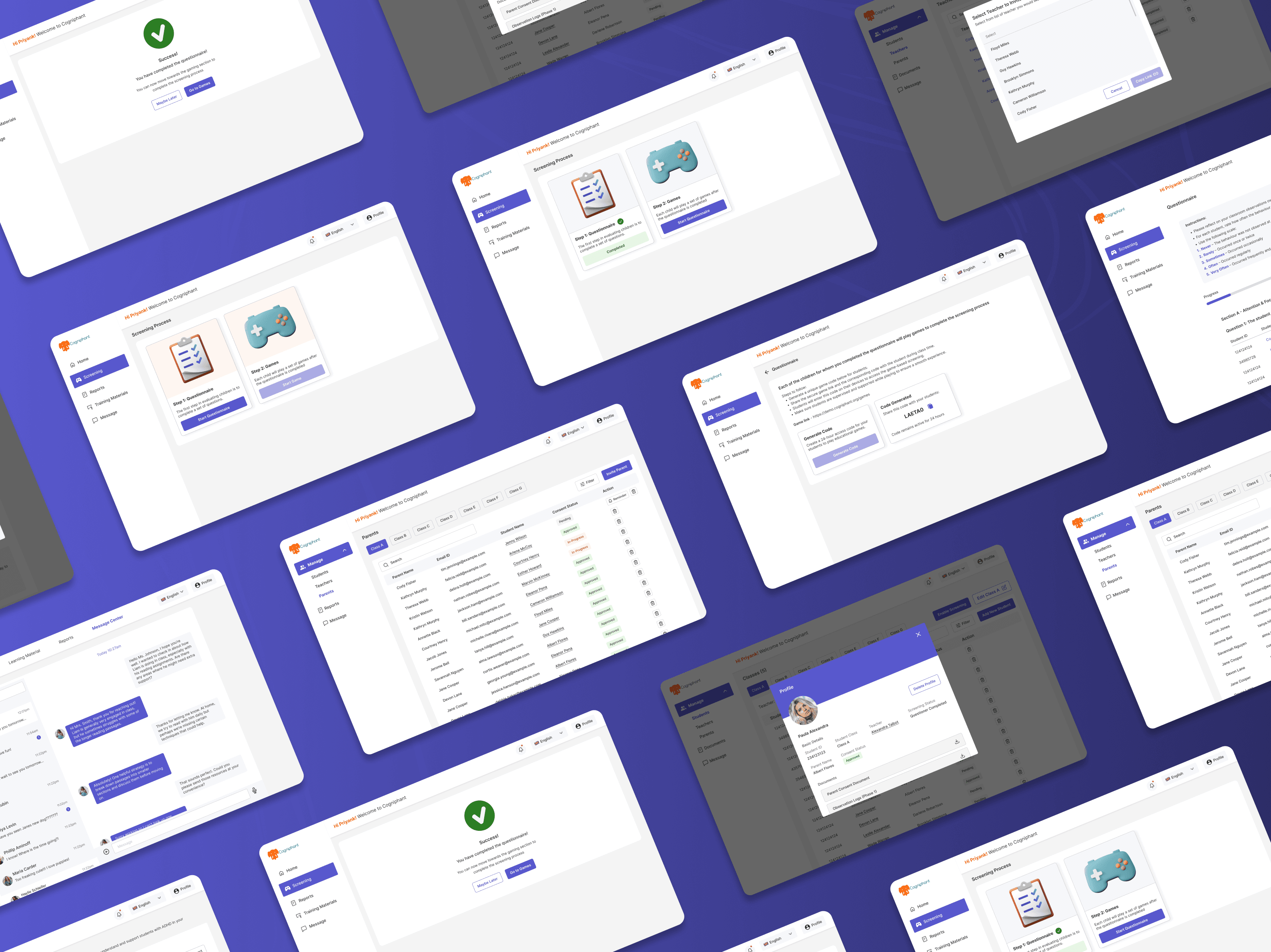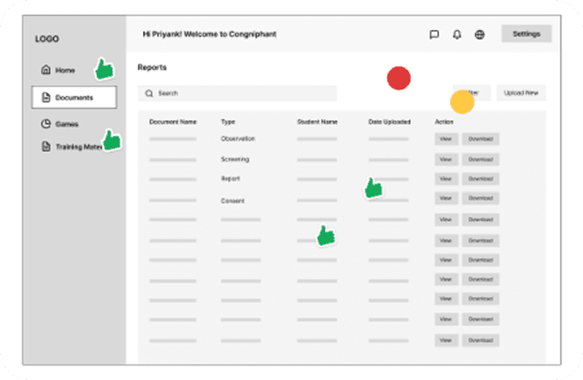 A clickable prototype was created to simulate the cross-role journeys, allowing stakeholders to walk through onboarding, documentation, screening updates, parent interactions, and student progress tracking. This became a key asset during stakeholder reviews.