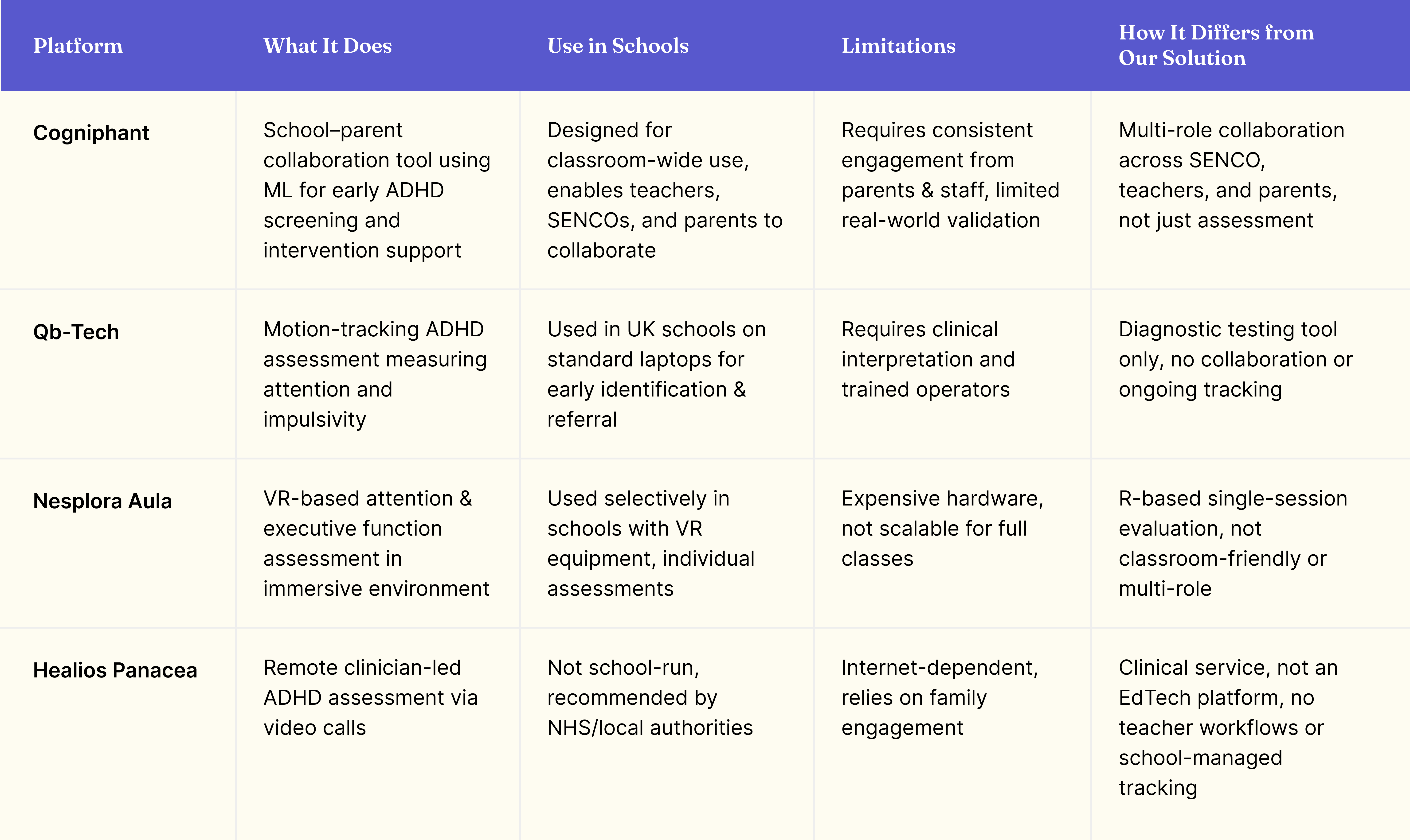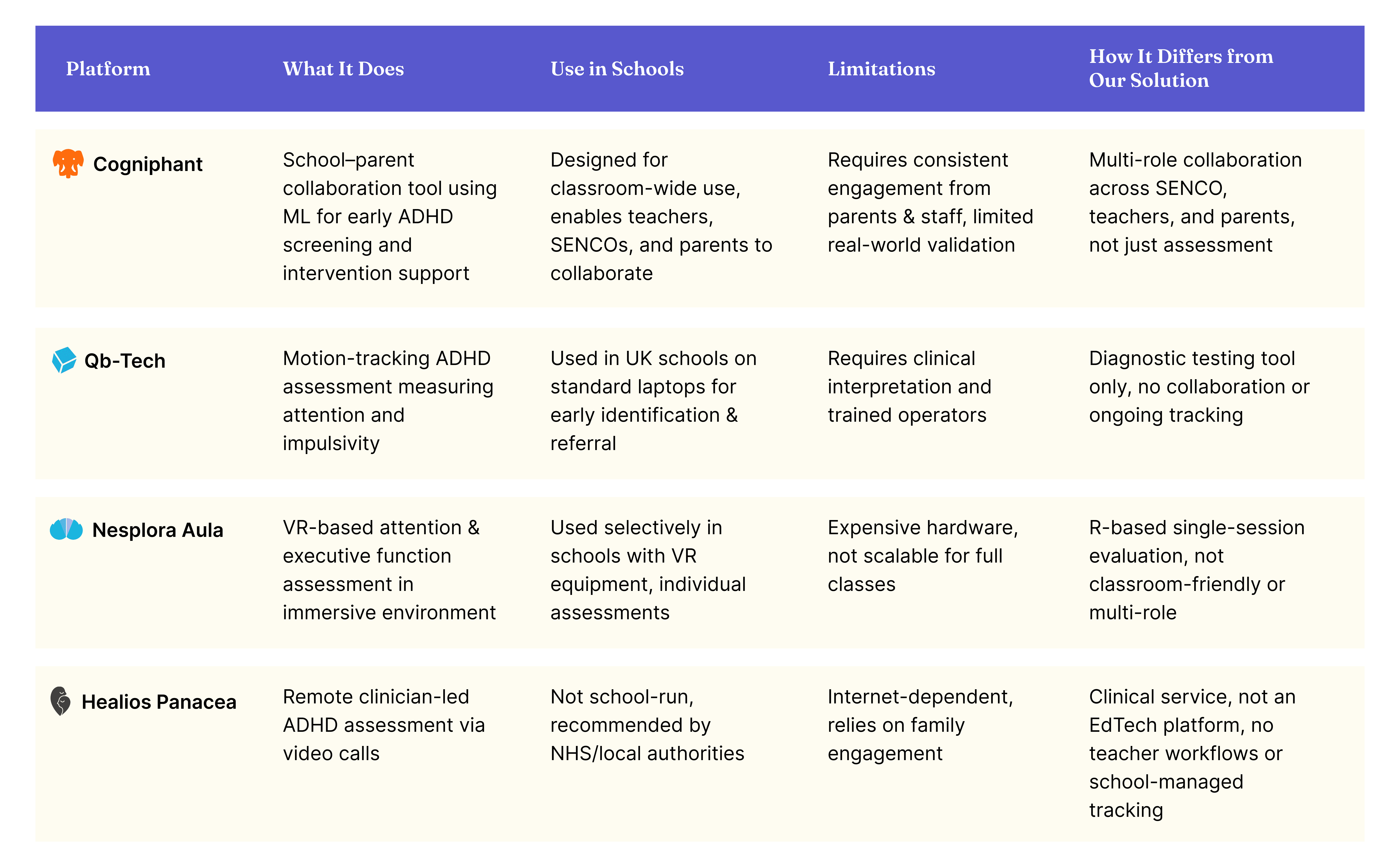 Schools in the UK use SEN (Special Educational Needs) processes to support students, especially those with ADHD or other learning differences. Cogniphant partnered with us to rethink their early-stage platform used in UK schools to support students with ADHD. At that time, the platform only consisted of two disconnected features, a screening tool and a game-based cognitive assessment. There were no dashboards, workflows, or role-based journeys to support collaboration across SENCOs, teachers and parents.
